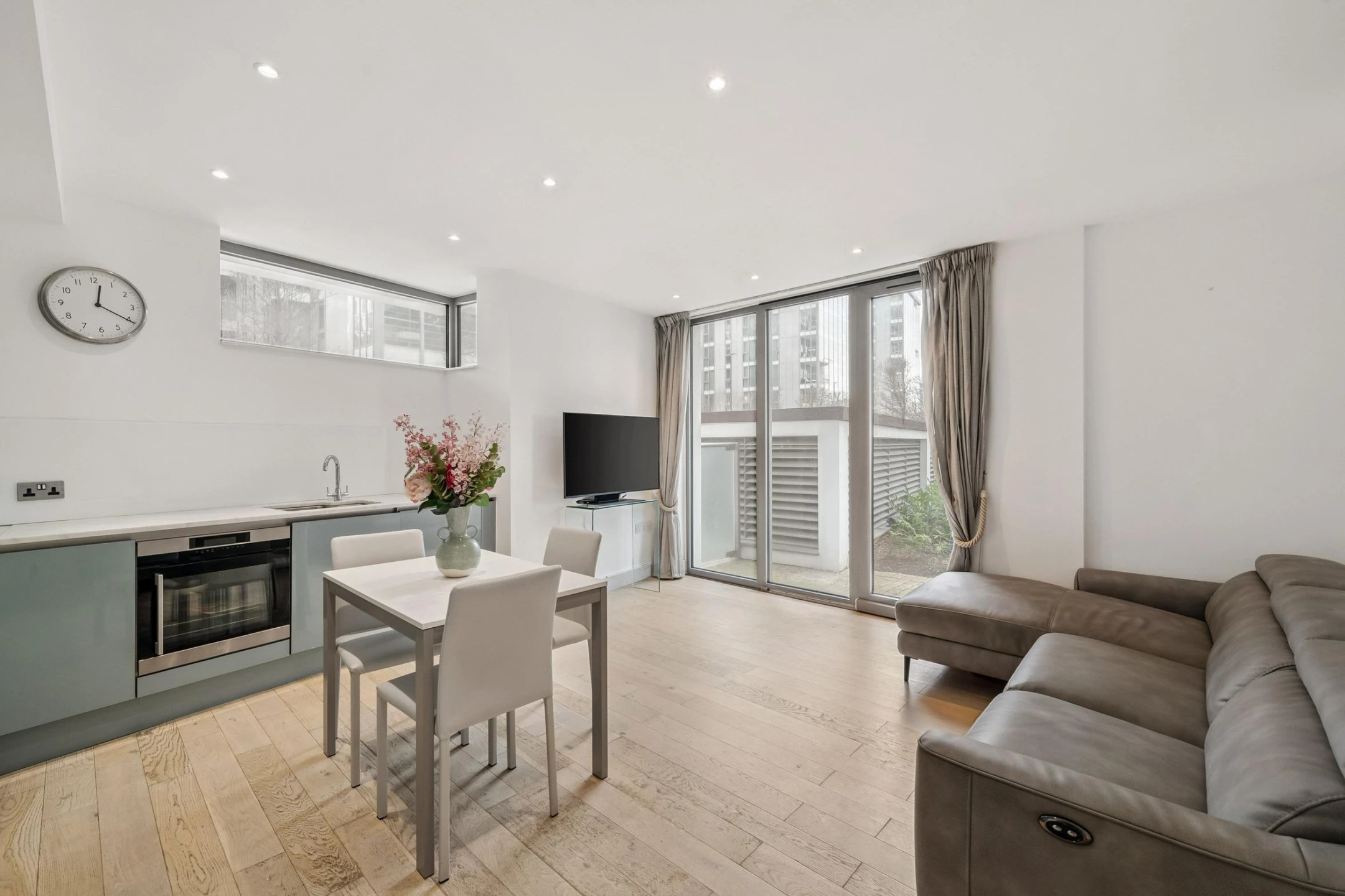 The apartment has been refurbished to a high standard and features a bright open-plan kitchen and reception room with excellent natural light. The kitchen is fitted with high-quality units and integrated appliances, complemented by underfloor heating throughout the kitchen, living area and both bedrooms.